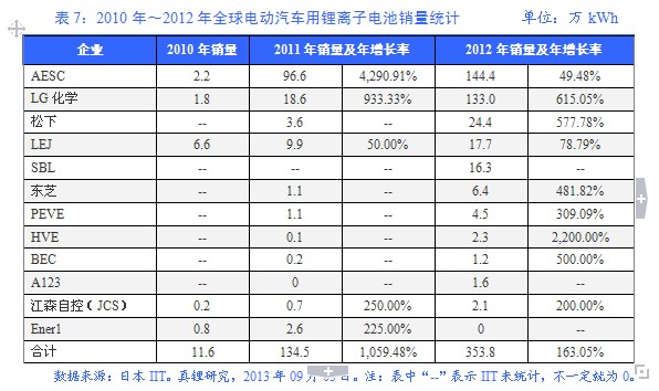 日本IIT對2010年至2012年的電動汽車用動力鋰離子電池年銷量的統計情況,見表7。這里需要指出的是,IIT在表中并沒有統計中國企業的情況,也沒有統計美國陶氏柯卡姆、威能、波士頓動力、奧鈦、K2能源,加拿大麥格納,法國Saft、博洛雷(Bolloré)等諸多企業的銷售情況。特別是博洛雷,2011年12月在法國巴黎開始的Autolib’服務(巴黎及其郊區城市的電動汽車出租服務,一期規劃截至2016年),博洛雷獲得了全部5,000輛電動汽車的訂單,其中2012年交付了1,800輛,動力鋰離子電池用量達到5.4萬kWh。因此,IIT統計的總量遠不是全球電動汽車用動力鋰離子電池的全部實際銷量。