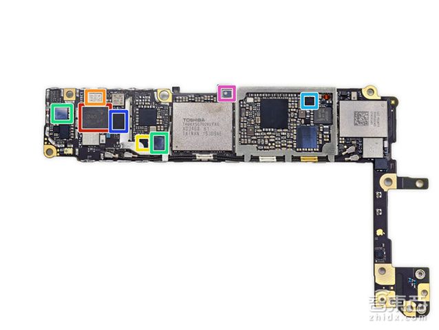 ① 紅色部分:村田240前端模塊; ② 橙色部分:威訊RF5150天線切換器; ③ 黃色部分:恩智浦1610A3芯片; ④ 綠色部分:Cirrus Logic 338S1285音頻IC; ⑤ 淺藍色