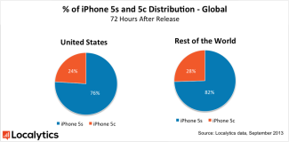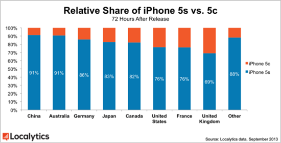 移動(dòng)應(yīng)用分析公司Localytics在新機(jī)發(fā)售后72小時(shí)后對(duì)2,000萬臺(tái)iPhone進(jìn)行了調(diào)查,調(diào)查發(fā)現(xiàn),全球范圍內(nèi)5S占新發(fā)售機(jī)型的78%,而在中國(guó)高達(dá)91%。
