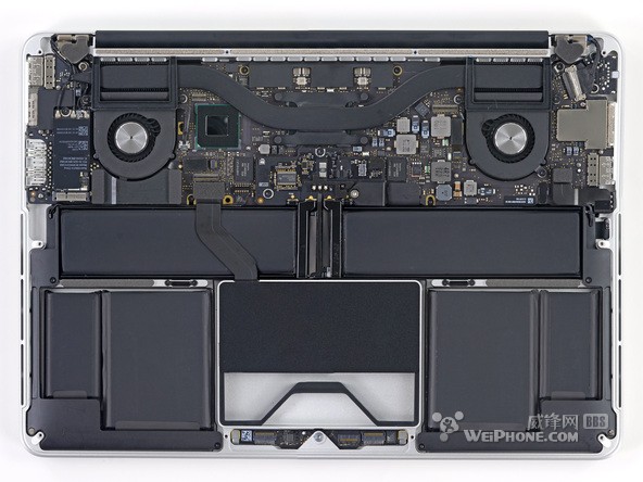 整塊電池一共由 6 個電池單元組成,整體看上去就像一個衣架。和 15 英寸 Retina Macbook Pro 的電池設計相比,“衣架”風格的設計為 13 英寸 Retina Macbook Pro 的內部節省了許多空間。