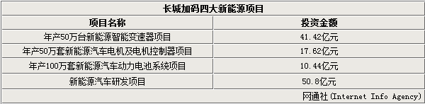 長城汽車除了強化新能源研發項目,新能源車的相關產業配套項目也已有所布局?!澳戤a50萬臺新能源智能變速器項目”總投資41.42億元,主演開展新能源智能變速器的研發、試驗和生產;“年產50萬套新能源汽車電機及電機控制器項目”總投資額17.62億元;“年產100萬套新能源汽車動力電池系統項目”總投資額為10.44億元。該項目產品涵蓋PHEV、EV、輕混、強混等四個子項目的配套動力電池系統(包括鋰離子動力電池組件和電池管理系統)。這三個項目建設周期均為30個月,地點位于河北省徐水經濟開發區。