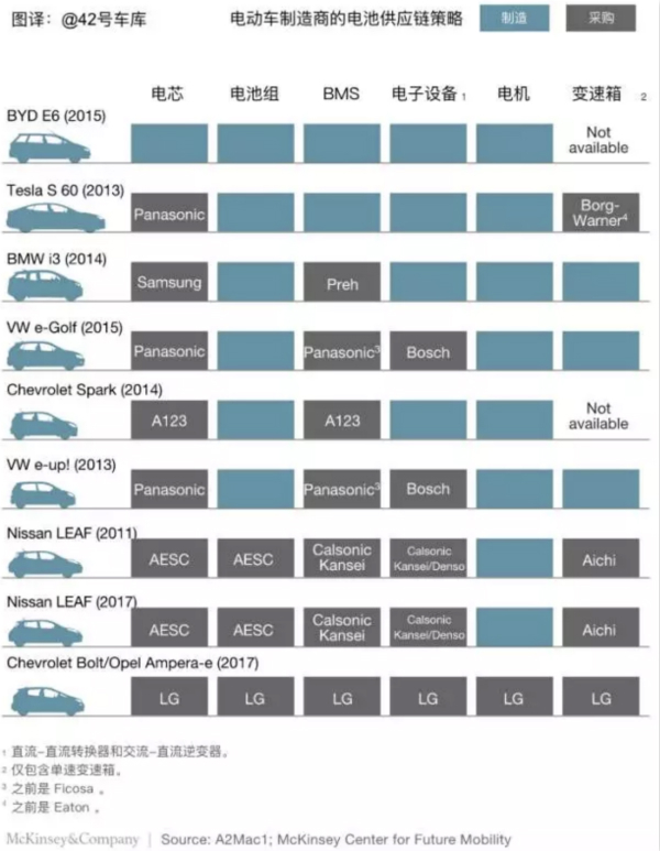 5、特斯拉和比亞迪在動力總成的垂直一體化上完成度是最高的,而通用則是采用了所有零部件都外包的策略,廠家的不同策略影響了傳統(tǒng)供應(yīng)商的競爭定位。
