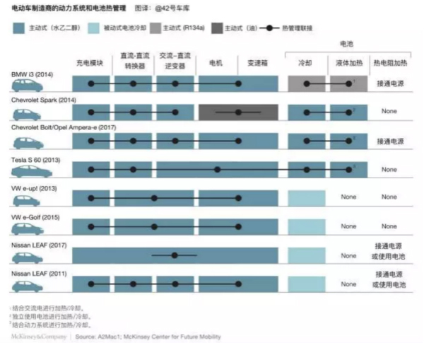我們也發(fā)現(xiàn)了熱管理的設(shè)計方法有著巨大的區(qū)別,比如電池冷卻系統(tǒng)就有四種不同的方案:被動式(自然風冷),主動式結(jié)合動力系統(tǒng)的,主動式獨立用于電池的,主動式結(jié)合空調(diào)電路的。