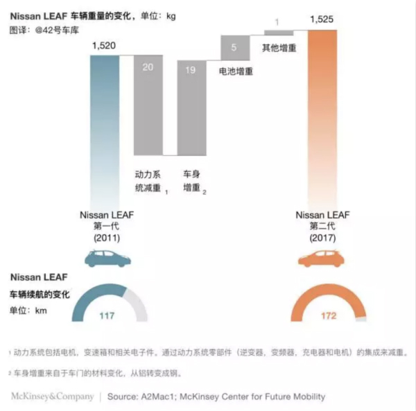3、在國內(nèi)廠商大肆宣傳鋁車身輕量化的同時,這些全球暢銷的電動車關(guān)注點卻不在鋁車身上,輕量化對于電池續(xù)航的影響權(quán)重似乎并沒有那么高。最有意思的是二代 Nissan Leaf ,車身重量竟然是增加的,而大幅的減重是來自于動力系統(tǒng)。