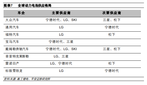 從客戶角度,電池供應商呈現兩超多強的格局。現階段 LG 和寧德時代是車企的主要供應商,而三星、SK、松下是次要供應商,LG 基本上是所有車企的主要供應商,寧德時代已經成為接近一半車企的主要供應商。