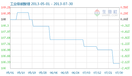 7月30日工業級碳酸鋰商品指數為106.28,與昨日持平,較周期內最高點112.10點(2012-11-04)下降了5.19%,較2012年01月05日最低點98.94點上漲了7.42%。(注:周期指2011-09-01至今) 工業級碳酸鋰商品指數自