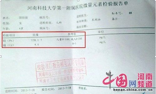 據(jù)媒體此前報道,今年7月中旬,西山底鄉(xiāng)南洞村數(shù)名兒童出現(xiàn)血鉛中毒,其中一名4歲女童小婕出現(xiàn)多動、厭食等癥狀,經(jīng)河南科技大學第一附屬醫(yī)院化驗檢查,結(jié)果顯示其血液中鉛含量達158.1ug/L(毫克/升)屬鉛中毒。