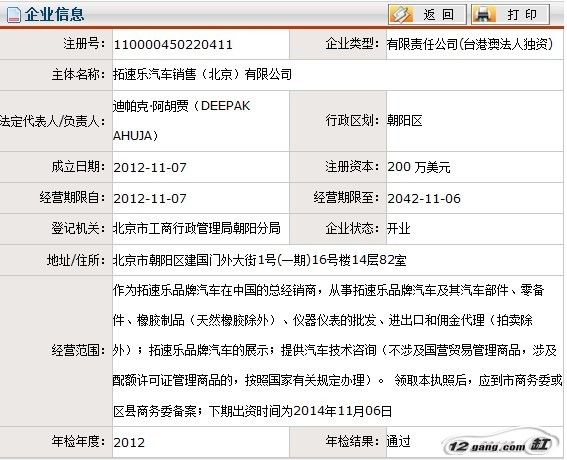 12缸通過北京市工商局的官方網(wǎng)站查詢得知,“拓速樂”公司于2012年11月7日已經(jīng)成立,注冊信息當(dāng)中的經(jīng)營范圍是如此描述的:作為拓速樂品牌汽車在中國的總經(jīng)銷商,從事拓速樂品牌汽車及其汽車部件、零備件、橡膠制品(天然橡膠除外)、儀器儀表的批發(fā)、進(jìn)出口和傭金代理(拍賣除外);拓速樂品牌汽車的展示;提供汽車技術(shù)咨詢(不涉及國營貿(mào)易管理商品,涉及配額許可證管理商品的,按照國家有關(guān)規(guī)定辦理)。 領(lǐng)取本執(zhí)照后,應(yīng)到市商務(wù)委或區(qū)縣商務(wù)委備案;下期出資時間為2014年11月06日 。