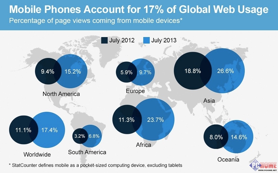 由于移動(dòng)智能設(shè)備的高速發(fā)展,人們上網(wǎng)的方式也隨之得到改變。過去我們通過傳統(tǒng)的桌面電腦上網(wǎng)沖浪,而如今每個(gè)人都可以通過自己手上的手機(jī)漫游全球網(wǎng)絡(luò)。根據(jù)StatCounter發(fā)布的最新報(bào)告顯示,截至至2013年7月,全球互聯(lián)網(wǎng)17.4%的網(wǎng)絡(luò)流量來自于移動(dòng)智能終端,這一數(shù)字與去年同期相比增長(zhǎng)了6%。