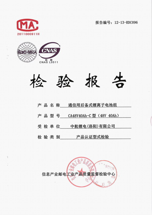 8月30日,中航鋰電成功獲得CA48V50Ah-C、CA48V40Ah-C型通信用后備式鋰離子電池組泰爾認證證書,這標志著公司CA48V50Ah-C、CA48V40Ah-C型通信用后備式鋰離子電池組獲得通信行業國家級認可,為公司開拓通信行業市場奠定了堅實基礎。