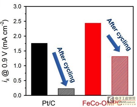 圖2:鉑/碳催化劑和FeCo-OMPC催化劑在一萬次工作前后的產生電流的對比