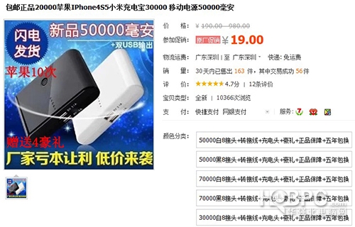通過上面的截圖,我們能夠獲知該賣家所售移動電源標稱為50000mAh,而售價僅僅才19元而已,如果讀者有經常關注華強北電腦網的話就會意識到這樣的定價和容量是存在問題的,不僅容量沒有那么多,而且電芯的質量肯定也存在問題,廢舊電芯是發生爆炸的原因之一。