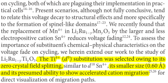 從上圖看到對比三種材料在充放電不同周數的微觀應力數值的大小,可以得出摻入了Ti4+的材料內部應力變化非常大,而摻入了Sn4+的材料則變動很小,這種內部應力的變化究竟是由什么造成呢?在Li2Ru0.75Ti0.25O3這里究竟發生了什么?我們來看下圖: