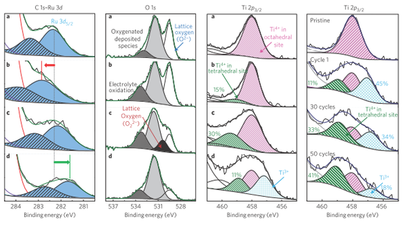 這個圖我們直接看最右邊的那張,Ti的XPS(X射線光電子能譜分析)數據表明,在經過了50周的循環后,四面體間隙的Ti4+含量達到了41%(通常Ti4+和Ru4+都是穩定的呆在八面體間隙),這也是為什么Li2Ru0.75Ti0.25O3的內部晶格應力變化如此劇烈的原因。
