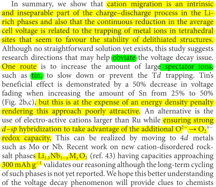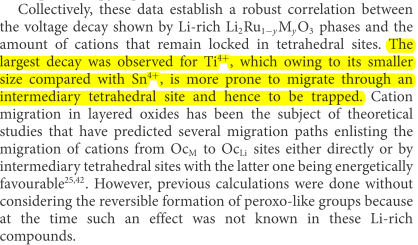通過觀察,他們得到,這種電壓衰減跟摻入離子的半徑有著直接的關(guān)系,如果半徑越小,比如Ti4+,就越容易發(fā)生遷移,也就越容易被四面體間隙所捕獲然后鎖住,隨著呆在四面體間隙的金屬離子越來越多,這樣就會產(chǎn)生比較嚴(yán)重的電壓衰減。