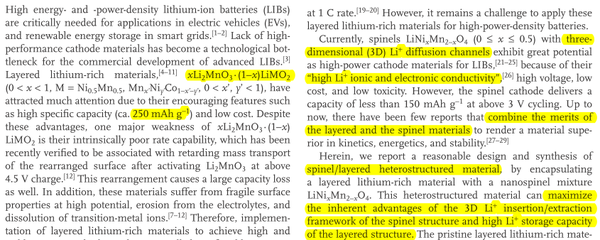 這種材料的好處就是,結(jié)合了富鋰的高比容量又能繼承尖晶石鎳錳酸鋰的優(yōu)異的倍率性能,因為這種尖晶石結(jié)構(gòu)能夠提供三維的鋰離子脫嵌通道,躥躥躥的運(yùn)輸鋰離子,而普通的三元材料只有二維的擴(kuò)散空間,這個速度是沒法比擬的!換句話說,這個材料的逼格還是蠻高的: