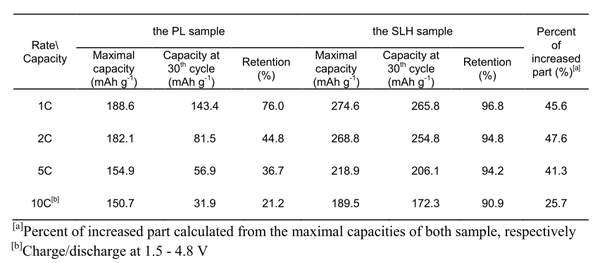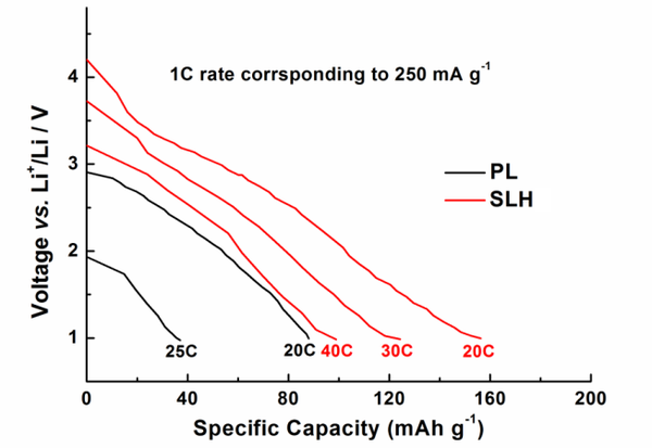 SLH的40C倍率數據還要好于PL的20C數據,這還讓富鋰混不?40C是什么概念?相當于1分半中就能有100mAh/g的比容量,這個誠意滿滿的是奔著電動車的終極方案——集動力與高比能為一體而去的,只不過嘿嘿,他們沒給充電曲線。而且他們放電到了1V,電化學的勢窗過大,這個是比較危險的,鑒于只是半電池的實驗,也就無所謂了。