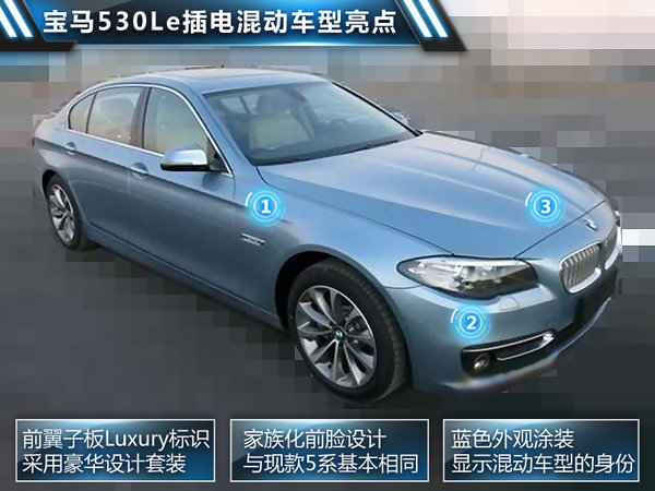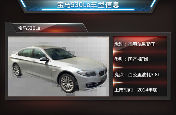 寶馬5系插電混動版的原型車此前在上海首發,代表著其在新能源領域的最新研發成果。寶馬集團負責企業財務的董事艾希納博士表示:5系混合動力車型將成為寶馬在華的首款插電混動產品,幫助我們進一步拓展國內C級豪華新能源轎車的細分市場。新車型將定名為“530Le”,與現款車型相比將大幅節約油耗,降低至3.8L/100km。此外,網通社走訪多家寶馬4S店后獲悉:寶馬530Le預計將在2014年內實現國產。