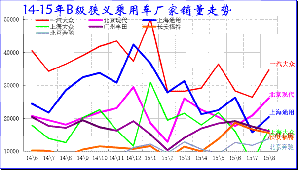 前期B級車形成一拖四的廠家競爭格局,今年一汽大眾領軍相對優越,但與二線的距離縮小,上海大眾、上海通用、北京現代和廣州豐田跟進的差距縮小,15年成為群雄混戰,近期的銳界也是推動福特的B級車表現超強。但其他的合資品牌B級車難以形成類似一汽大眾的B級車組合。