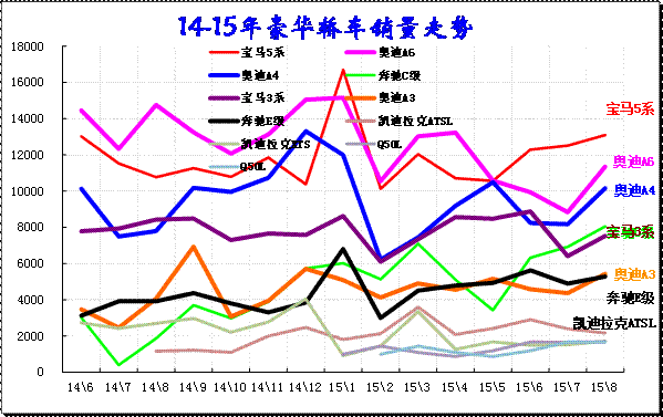 豪華B級車的地位總體提升,寶馬3系表現較強,奧迪A4的增長壓力較大,豪車的走勢呈現相互追趕的局面。這也對高端的德系B級車產生一定影響。