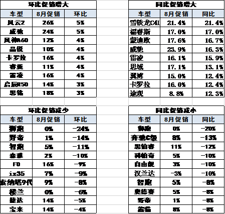 今年8月的主力車型促銷力度增加較大,其中的日系的車型的促銷的增加較多,自主品牌也有個別車型促銷增大較多。