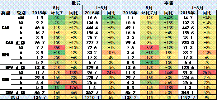 8月的狹義乘用車零售走勢較強主要是A0級SUV車的同比增長帶來的增量。而B級和C級SUV的增長也有改善的趨勢。