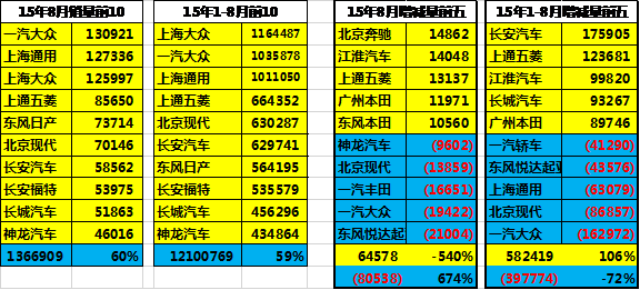 15年8月的前10位主力車企的銷量貢獻度達到60%,強于15年的1-8月的主力車企表現。15年8月的前5位增量主力車企的增量異常突出,其中自主品牌的主力車企在8月的銷量排名較好, 長安汽車和江淮的表現都很不錯。