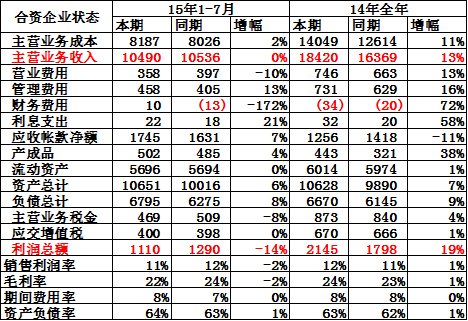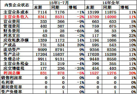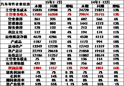 15年1-7月汽車零部件企業的收入和成本均增長較好,利潤同比增13%。其中的增值稅和主營稅金均增長較好。