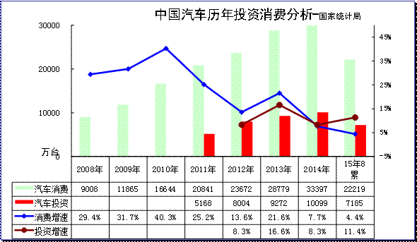2015年1-8月份,全國(guó)固定資產(chǎn)投資(不含農(nóng)戶)338977億元,同比名義增長(zhǎng)10.9%,增速比1-7月份回落0.3個(gè)百分點(diǎn)。第二產(chǎn)業(yè)中,工業(yè)投資137087億元,同比增長(zhǎng)8.7%,增速比1-7月份回落0.3個(gè)百分點(diǎn);其中,采。1-8月汽車行業(yè)投資增長(zhǎng)11.4%,放緩較大。