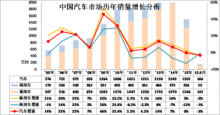 圖表 1汽車05-2015年表現(xiàn)對(duì)比分析 單位 萬(wàn)臺(tái),%