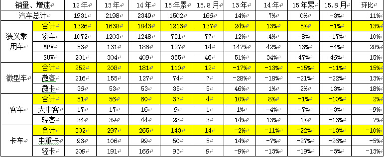 根據(jù)中國(guó)汽車工業(yè)協(xié)會(huì)數(shù)據(jù),14年汽車總計(jì)銷量2350萬(wàn)臺(tái),累計(jì)增速7%;15年1-8月汽車總計(jì)銷量1500萬(wàn)臺(tái),同比增長(zhǎng)0%,8月增速較年度增速增速相對(duì)偏低,這主要是乘用車的較差,而商用車表現(xiàn)有所改善。15年1-8月的乘用車增速達(dá)到3%,增速稍弱于預(yù)期。