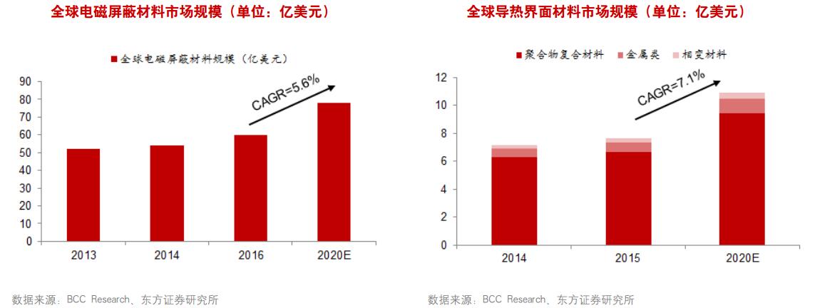 東方證券指出,根據第三方預測,全球EMI/RFI屏蔽材料市場規模將于2021年達78億美元,界面導熱材料將于2020年達11億美元規模,而屬于新興行業的石墨散熱材料,在消費電子領域的市場規模已達近百億元人民幣。