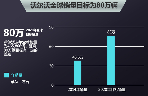在過去的2014年,沃爾沃全球銷量達到了465,866輛,這其中得益于中國等市場的快速增長。在沃爾沃的規劃中,計劃在2020年全球銷量提升至80萬輛,除了中國市場的增長之外、美國以及歐洲本土等市場也將是全球80萬輛的重要增長點。對于沃爾沃而言,清晰的產品規劃以及兩大模塊化架構的全面使用,將幫助沃爾沃在產品實力上得到大幅提升,其也正踏著堅實的腳步向80萬輛的目標邁進。