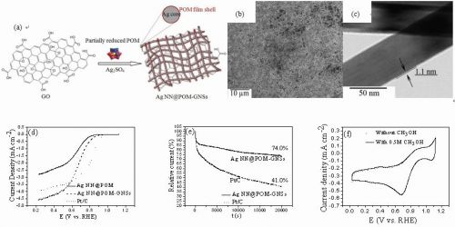 (a) Ag NN@POM-GNSs納米復(fù)合材料制備示意圖,(b) Ag NN@POM-GNSs納米復(fù)合材料SEM照片,(c) Ag NN@POM-GNSs納米復(fù)合材料TEM照片,(d) ORR線性掃描伏安曲線對比,(e) 穩(wěn)定性能測試,(f) Ag NN@POM-GNSs修飾電極抗甲醇干擾性能