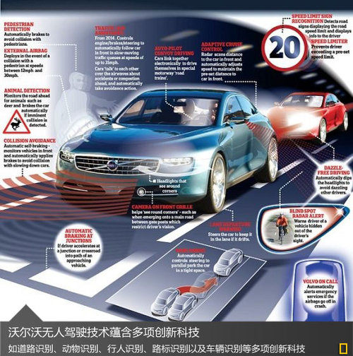 沃爾沃即將在2014年推出的可全自動駕駛的汽車,裝備了沃爾沃開發(fā)的全新交通堵塞輔助系統(tǒng),目前已有實車在測試中。這個系統(tǒng)可以讓汽車以50km/h以下的速度自動跟隨前方車輛行駛。