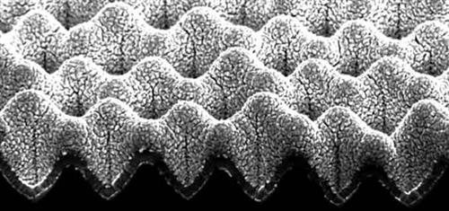 傳統的固體氧化物燃料電池薄膜都是平板結構,平面薄膜易于加工生產,但沒能最充分地利用空間,所以Prinz團隊對這種薄膜進行了一系列的提升。首先,它們設計制造的薄膜坑坑洼洼、凹凸不平,從而增大了可以用來傳遞氧離子的表面面積;其次在起皺的表面設計出微型顆粒凸起結構,看起來跟砂紙類似,進一步增加了固體氧化物和氧氣的潛在接觸點;然后薄膜的厚度也得到了不小的減低,氧離子移動到燃料側變得更簡單方便。這款創新薄膜厚度僅有60納米,大約是玻璃紙厚度的兩百分之一。
