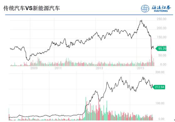 技術(shù)變遷的情況和中國產(chǎn)業(yè)的變化,我不知道大家對投資會不會熟悉,這是兩個公司股價的變化(見PPT),上面這張圖是大眾汽車,就是德國的大眾,在美國出了一個環(huán)境事件,它差不多是兩個月的時間把四年的漲幅全部跌沒了。另外一個是特斯拉的股價,在過去的兩三年曾經(jīng)漲到超過10倍。這就是資本市場對汽車變革狀態(tài)中給的看法和觀點。所以對于傳統(tǒng)的汽車,肯定要往對環(huán)境和節(jié)能越來越重視;對新能源汽車,大家是非常看好。