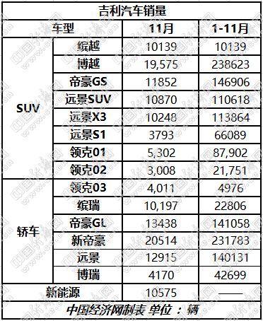 相比之下,勢頭強勁的吉利汽車,在公布數據上則事無巨細。官方數據顯示,吉利汽車在11月份的銷量(含領克品牌汽車銷量)為141661輛,同比增長0.3%;前11個月銷量達到1407505輛,較去年同期增長29%,約完成其全年158萬輛銷量目標的89%。