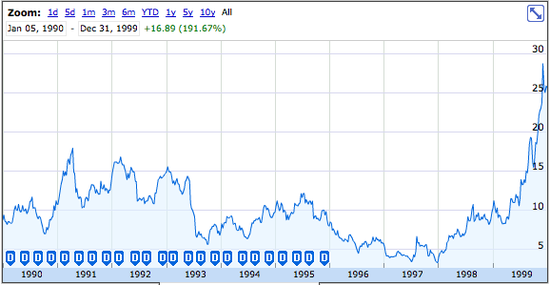 在蘋果處于最困難時候,史蒂夫·喬布斯伴隨著公司對NeXT的收購而回到蘋果。隨后,喬布擔當著引領蘋果創新和實現增長的使命。到1990年末,蘋果已經實現了又一個10年的增長,其股價在1990年代的10年中增長了191.67%。