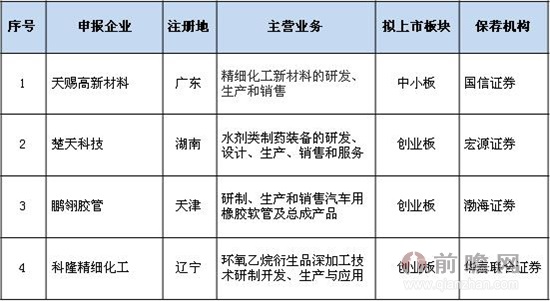 根據(jù)IPO咨詢機(jī)構(gòu)前瞻投資顧問的不完全統(tǒng)計(jì)發(fā)現(xiàn),在已通過(guò)發(fā)審會(huì)的83家企業(yè)中,有4家屬于新材料行業(yè),包括廣州天賜高新材料、楚天科技、天津鵬翎膠管以及遼寧科隆精細(xì)化工。新材料屬于社會(huì)生產(chǎn)中的基礎(chǔ)性產(chǎn)業(yè),其應(yīng)用領(lǐng)域廣闊,涵蓋內(nèi)容豐富,因此上市需求和活躍度也十分明顯。