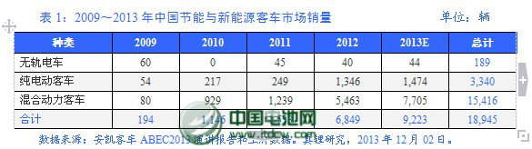 在2013年中國(宜春)鋰電新能源產業國際高峰論壇(ABEC 2013)上,安凱客車的演講顯示:2013年前7個月,中國共銷售節能與新能源客車9,111輛,其中混合動力客車7,703輛,占比84.5%,較去年同期的1,928輛增長了273.9%;純電動客車1,408輛,占比15.5%,較去年同期的509輛增長了176.6%。原因分別是:①混合動力客車銷量大增主要受益于2012年下半年混合動力客車示范范圍擴大,推動了這個市場的“井噴”;②純電動客車銷量大增主要是受益于市場對國家純電動客車推廣政策延續的判斷,示范城市推廣工作目標的繼續完成,以及城市純電動基礎設施的不斷完善。