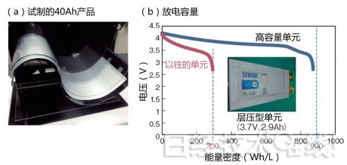 積水化學打算涉足的鋰離子充電電池是容量約為目前3倍的層壓型單元(圖1)注1)。該公司在新聞發布會上展示了容量約為40Ah的大型層壓型單元。能量密度方面,以電壓為3.7V,容量為2.9Ah的層壓型單元為例,單位體積的能量密度達到900Wh/L,單位重量達到340Wh/kg。