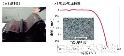 積水化學開發出了可在室溫下制造的染料敏化太陽能電池(a)。在薄膜基板上制作時也實現了8%的轉換效率(b)。(圖(b)由《日經電子》根據積水化學的資料制作)