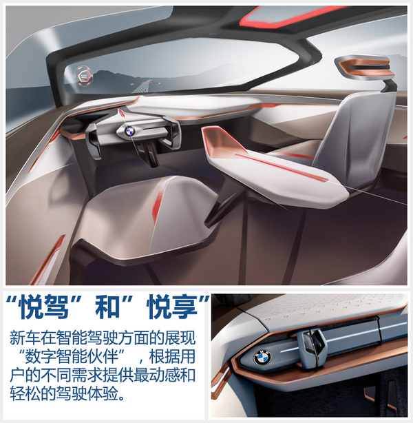 在車(chē)內(nèi)還有一個(gè)比較吸人眼球的就是位于儀表板中間的“寶石”,這其實(shí)是新車(chē)在智能駕駛方面的展現(xiàn)“數(shù)字智能伙伴”。通過(guò)對(duì)于駕駛者習(xí)慣的分析,可以自動(dòng)執(zhí)行一些常規(guī)任務(wù),并且駕駛者需要時(shí)提供恰當(dāng)?shù)慕ㄗh。之前我們還提到了關(guān)于“BMW VISION NEXT 100”概念車(chē)配備的“悅駕”(Boost)和”悅享”(Ease)兩大模式,其指在根據(jù)用戶的不同需求提供最動(dòng)感和輕松的駕駛體驗(yàn)。首先,在“悅駕” (Boost)模式中,車(chē)輛將以駕駛者為中心,提供多種智能化支持。同時(shí)座椅、方向盤(pán)甚至數(shù)字智能伙伴將縮回儀表板內(nèi),中控臺(tái)也更多地朝向駕駛者。而當(dāng)切換到“悅享”模式時(shí),車(chē)輛將進(jìn)入主動(dòng)控制模式,數(shù)字智能伙伴會(huì)自動(dòng)彈出,成為人機(jī)溝通的界面。