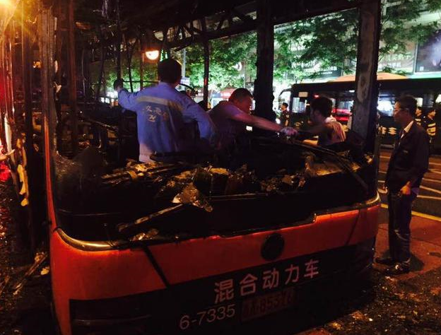 大火撲滅后,公交車也基本報廢,僅剩下鐵架子,路面上散滿一堆碎玻璃渣。目前,受輕傷人員已被送往醫院診治。