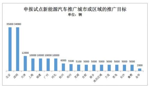 記者通過(guò)對(duì)深圳等18個(gè)申報(bào)城市或區(qū)域的調(diào)研,了解到大部分城市按照5000輛的目標(biāo)上報(bào)。其中,北京目標(biāo)定得最高,為3.5萬(wàn)輛;深圳緊隨其后,為3.498萬(wàn)輛;天津?yàn)?.2萬(wàn)輛;上海和廣州各1萬(wàn)輛;福建和河北的城市群1萬(wàn)輛。總申報(bào)推廣目標(biāo)17.558萬(wàn)輛。