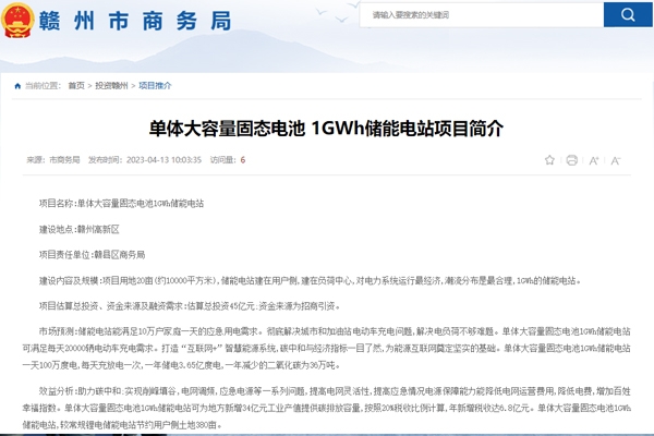45億元!江西贛州擬投建單體大容量固態電池1GWh儲能電站
