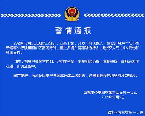9月5日16時16分許,四川南充順慶區富民街,一輛特斯拉轎車撞上多輛車輛和路邊行人。據當地警方 ... 查閱全文
