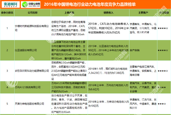 2016年中國鋰電池行業動力電池年度競爭力品牌榜單