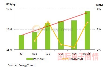 EnergyTrend研究經(jīng)理胥嘉政指出,多晶硅價(jià)格第二季微幅下滑后,2013年下半年隨即一路向上,根據(jù)EnergyTrend的資料顯示,自七月多晶硅價(jià)格來(lái)到近期的相對(duì)低點(diǎn)US$16.32/kg后,自此價(jià)格從未跌破US$16.4/kg的價(jià)位,而第四季多晶硅價(jià)格更是站上US$17.0 /kg的關(guān)卡,年底現(xiàn)貨市場(chǎng)的平均交易價(jià)格已經(jīng)逼近US$18.0/kg。從月平均價(jià)格來(lái)看,2013年下半年多晶硅現(xiàn)貨價(jià)格漲幅達(dá)7.2%,十二月的月均價(jià)已來(lái)到US$17.5/kg的水準(zhǔn),2014年一月平均價(jià)位上看US$19.0/kg到US$20.0/kg之間。